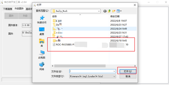 在弹出的窗口选择相应的固件,然后点击[打开],选择解压好的ROC-RK3588S-PC_Ubuntu20.04-Gnome-r240_v1.0.6f_230404.img。