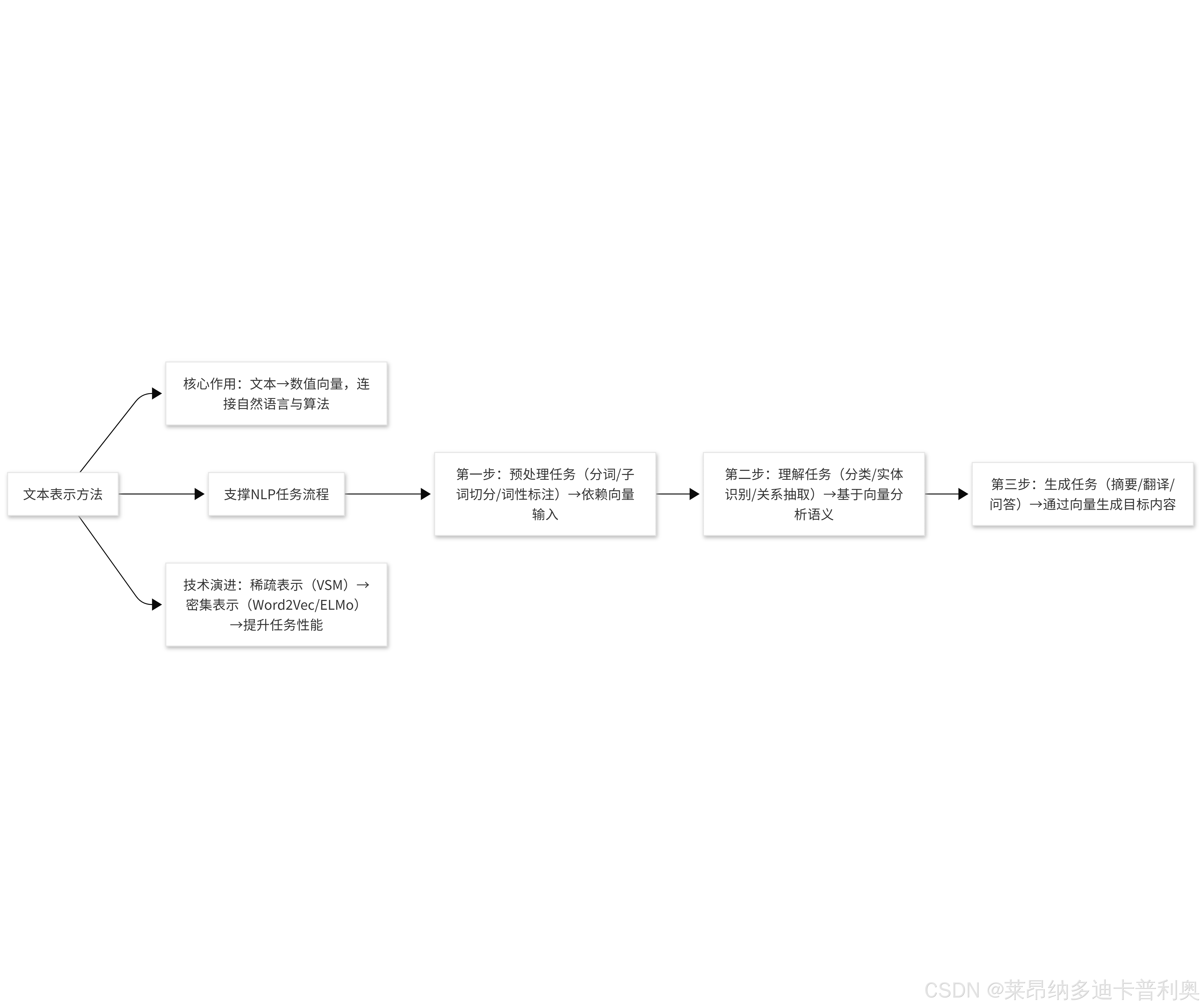 文本表示是所有 NLP 任务的前置基础:无合理的文本向量,NLP 任务无法落地;更优的文本表示(如从稀疏向量到密集向量),能显著提升 NLP 任务的准确率和效率(例:Word2Vec 相比传统向量空间模型,更能捕捉语义关系)。