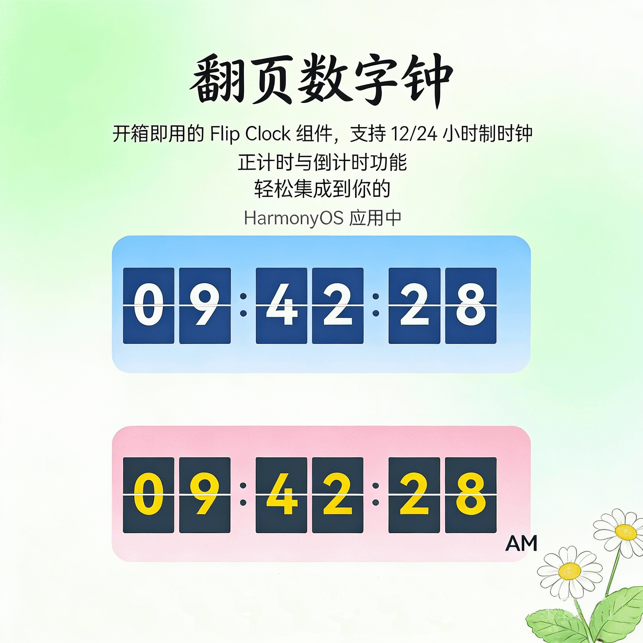 - 丝滑的机械质感:基于 ArkTS 原生动画能力,还原了物理时钟叶片下落的重力感,不是简单的图片替换。