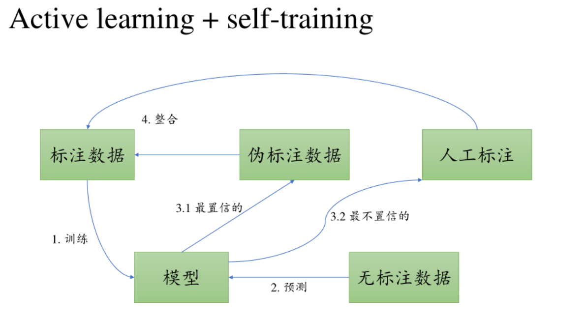 标注的数据训练模型,用模型给没标注的做标注,保留执行度高的标注数据,整合到标注数据的数据集里;置信度低的人工来做