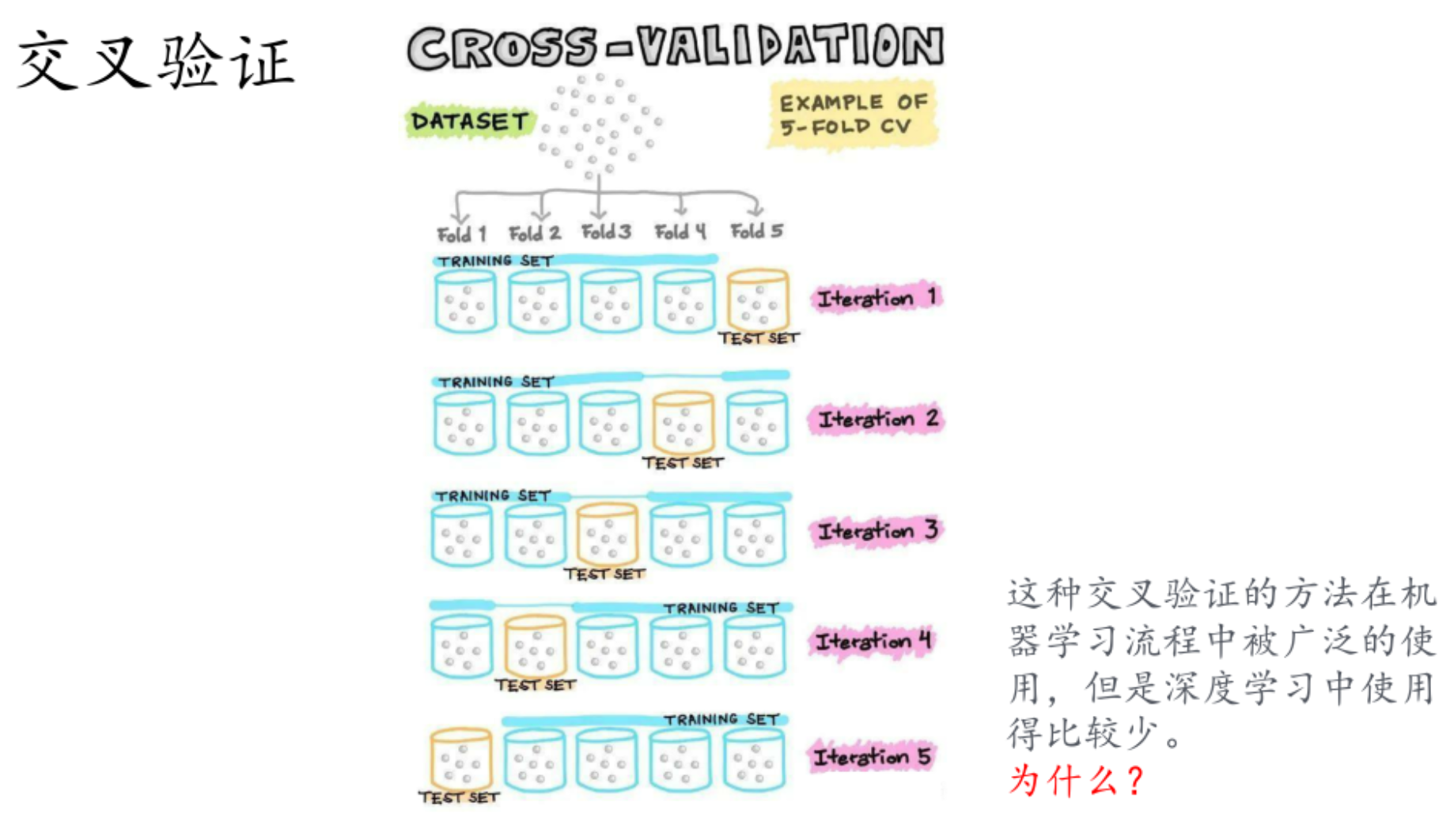 交叉验证的本质是通过 "多次划分训练 / 验证集、重复训练模型" 来评估模型泛化能力,但其设计前提是 "数据量小、模型训练快" ------ 而深度学习恰好相反,这导致交叉验证在深度学习中 "性价比极低"。但深度学习的应用场景大多满足 **"大数据假设",**无需交叉验证 "补精度"