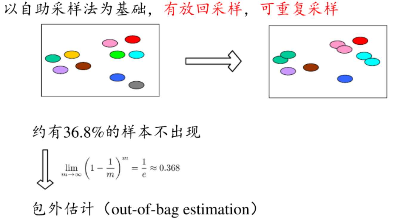 - 抽样过程:假设原始训练集包含n个样本。每次从原始训练集中随机抽取一个样本,将其复制并放回原始训练集中,使得该样本在下一次抽样时仍有可能被选中。重复这个抽样过程n次,这样就得到了一个自助样本集,该样本集也包含n个样本。