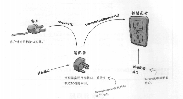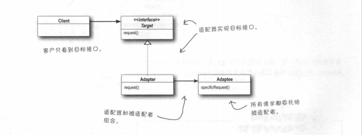- 适配器使用被适配者接口,把请求翻译成被适配者上的一个或多个调用。