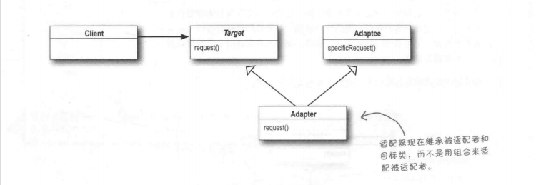 与对象适配器比较像。类适配器继承了Target和Adaptee,而对象适配器用组合把请求传递给Adaptee。对象适配器和类适配器使用两种不同的适配方式(组合与继承),正如前面博客笔记说的,组合优于继承,组合时我们松耦合,更易扩展,能够改变行为,更容易遵循单一职责原则。