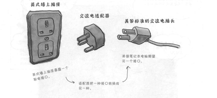适配器在生活中随处可见。比如,我们在美国使用英国接口的电器,就需要一个适配器来美转英。如下图: