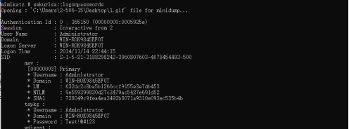 继续执行sekurlsa::logonpasswords命令: