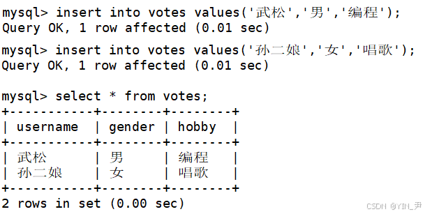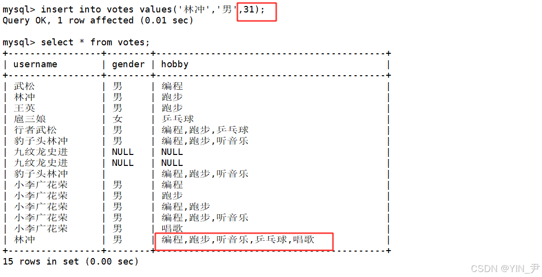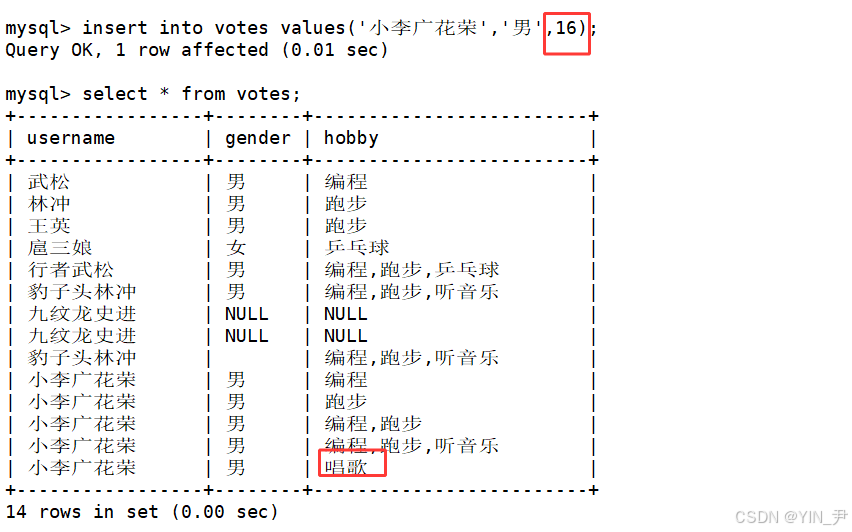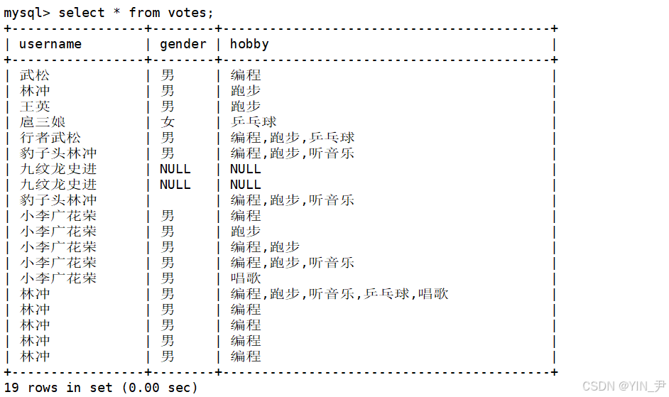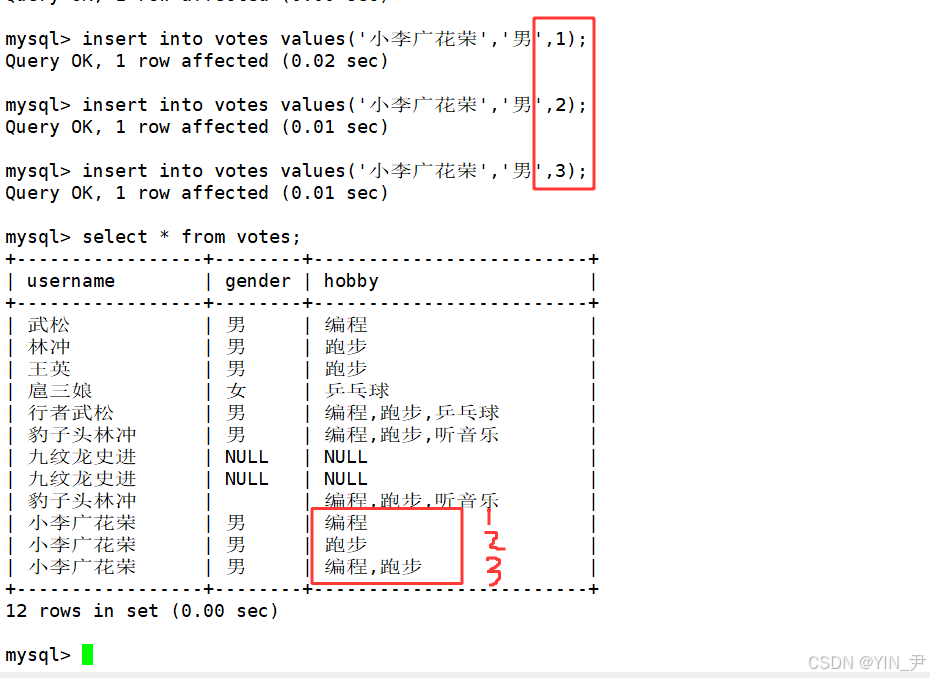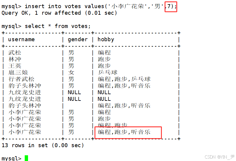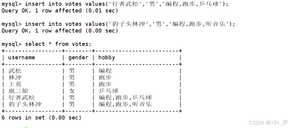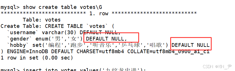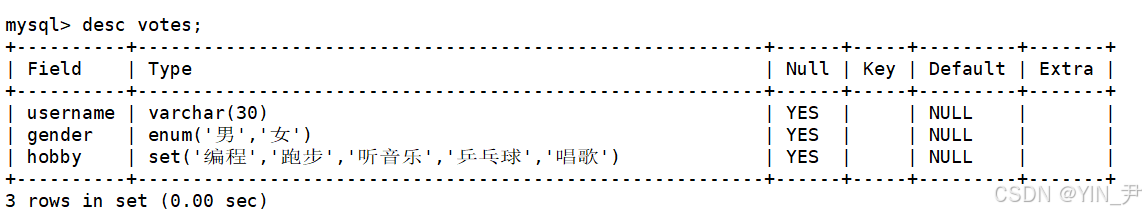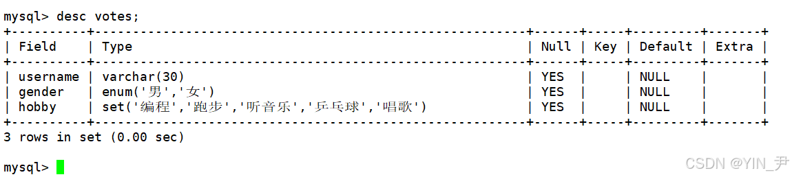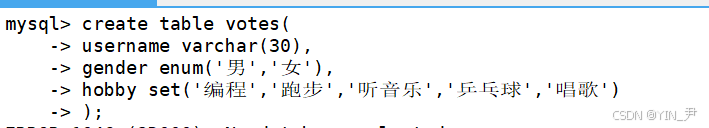 create table votes( username varchar(30), gender enum('男','女'), hobby set('编程','跑步','听音乐','乒乓球','唱歌'));