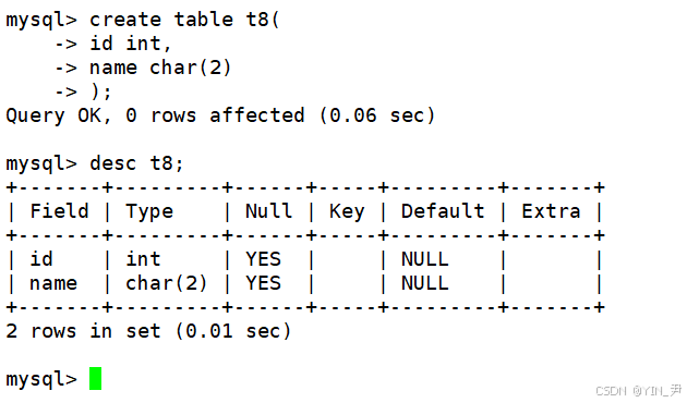 create table t8( id int, name char(2));