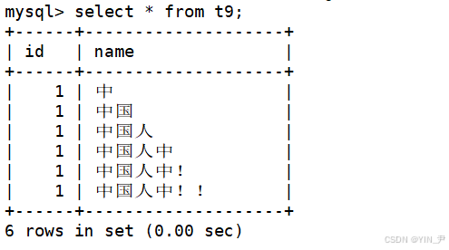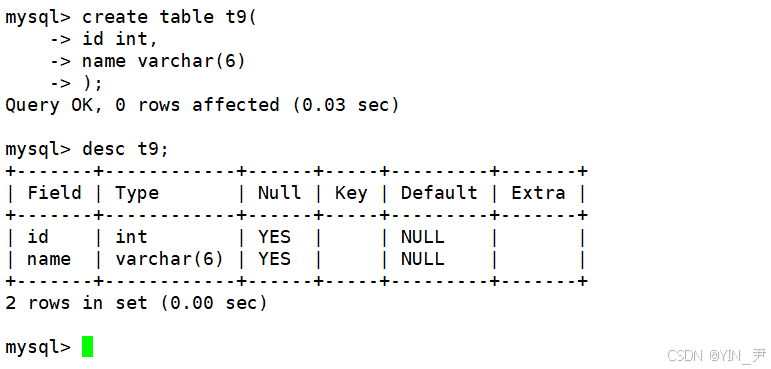 create table t9( id int, name varchar(6) );