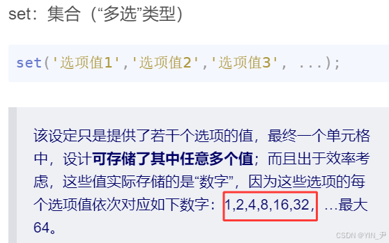 该设定只是提供了若干个选项的值,最终一个单元格中,设计可存储了其中任意多个值 ;而且出于效率考虑,这些值实际存储的是"数字",因为这些选项的每个选项值依次对应如下数字:1,2,4,8,16,32,...最大64。