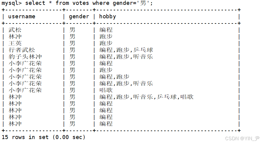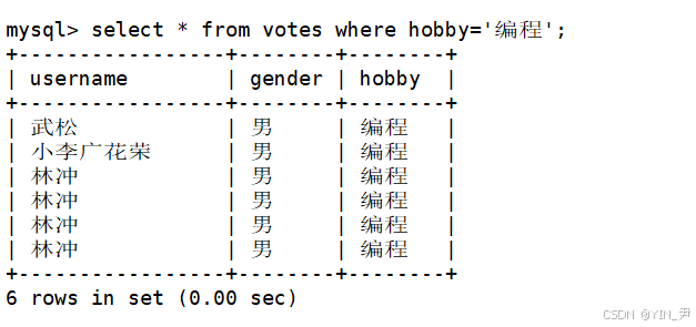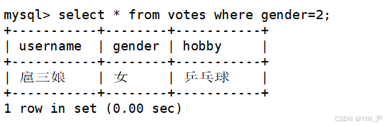 select * from votes where gender='男';(where后面跟的就是条件,类似C/C++中的if)