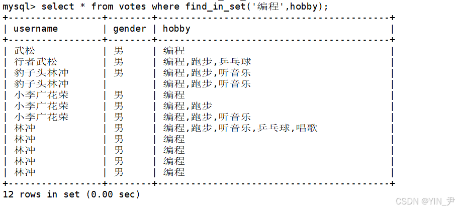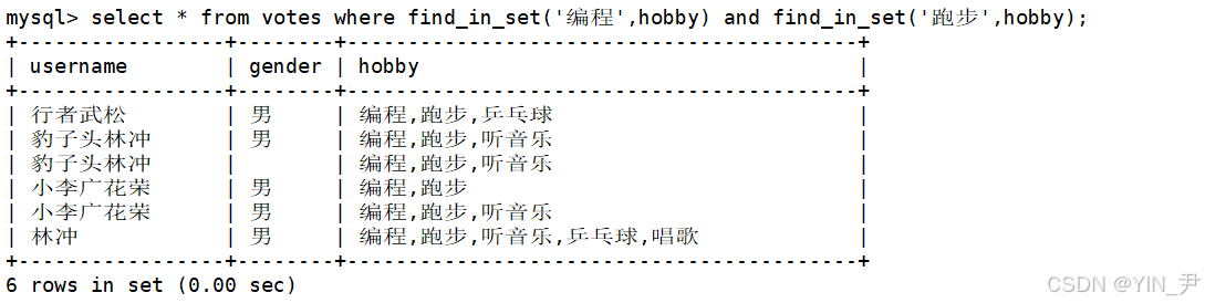 select * from votes where find_in_set('编程',hobby) and find_in_set('跑步',hobby);