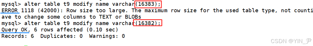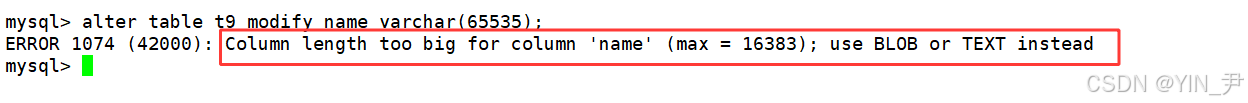 alter table t9 modify name varchar(65535);