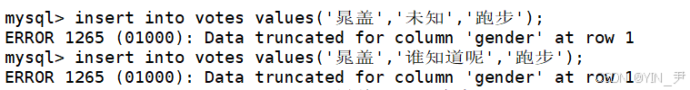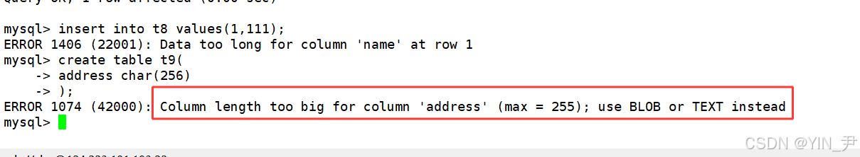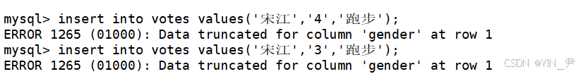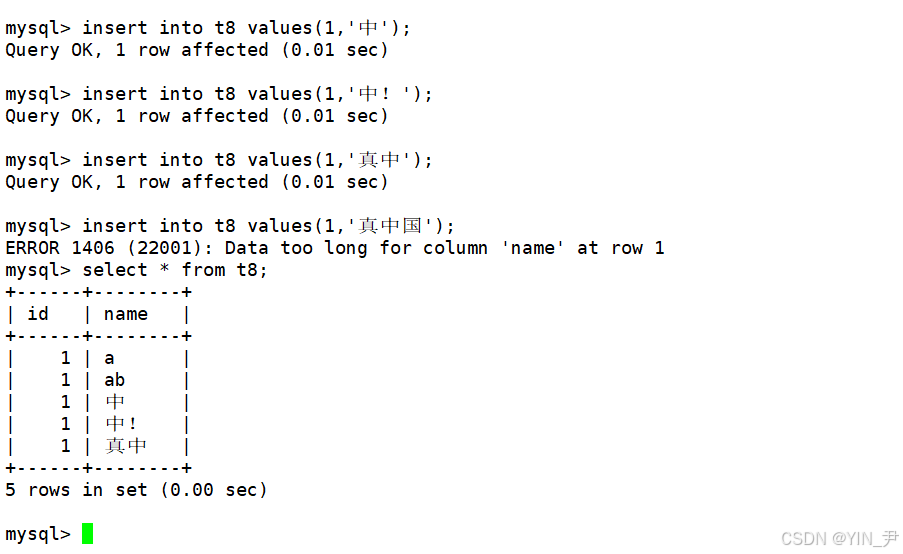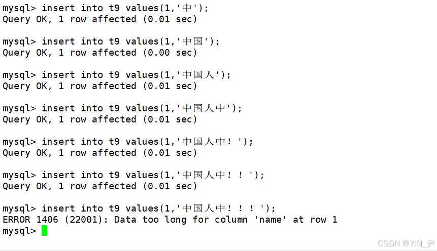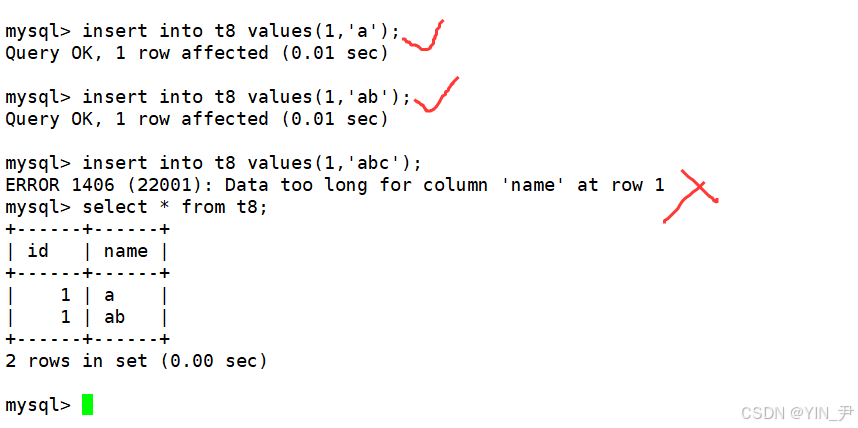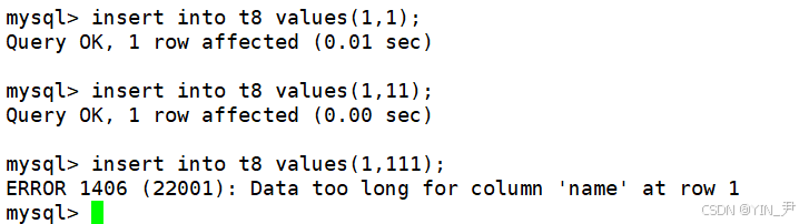 对于name这一列,因为它的长度是2,所以我们插入长度为1的字符串可以,2也可以,但是超过2就不行了