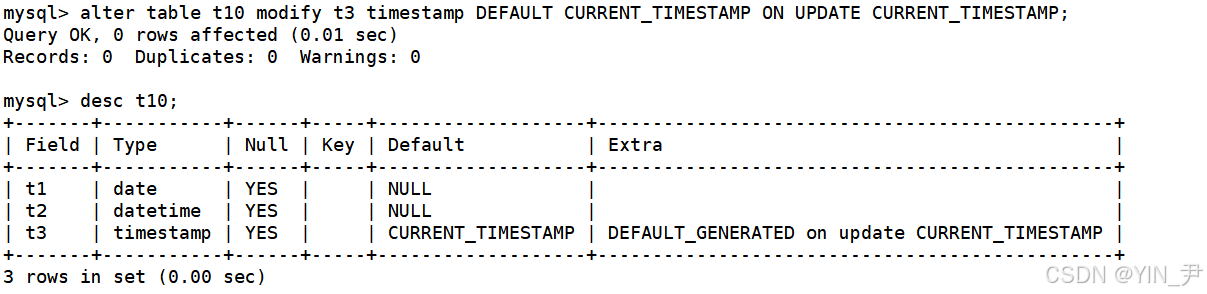alter table t10 modify t3 timestamp DEFAULT CURRENT_TIMESTAMP ON UPDATE CURRENT_TIMESTAMP;