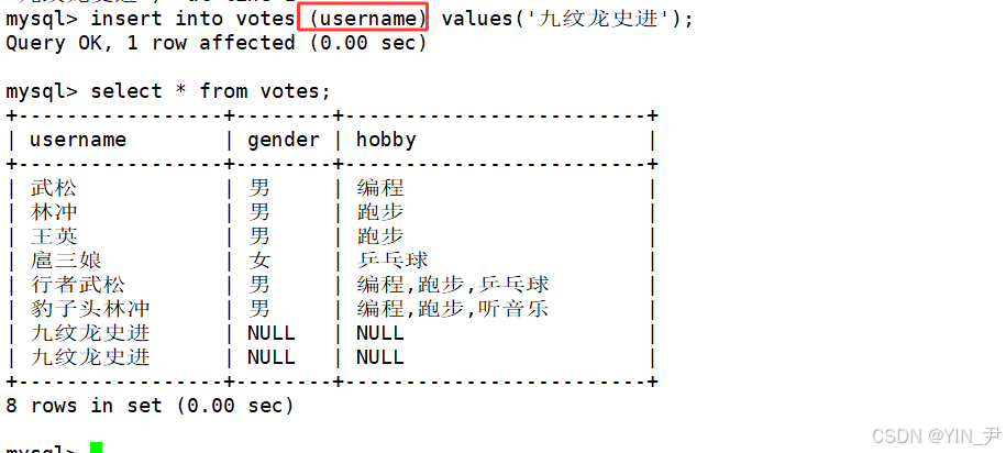 另外,如果我们只插入姓名,其余两列默认为空