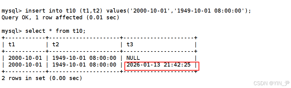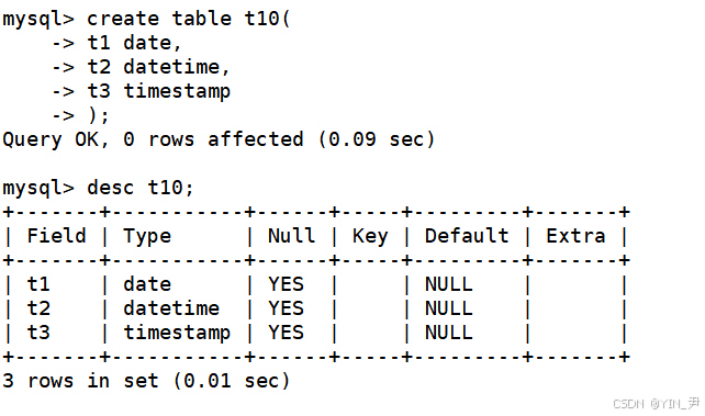 create table t10( t1 date, t2 datetime, t3 timestamp );
