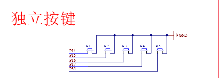 采用上拉输入模式的按键电路,按键未按下时引脚默认高电平,按下时引脚与 GND 短路变为低电平,程序只需检测引脚是否为低电平即可判断按键是否按下