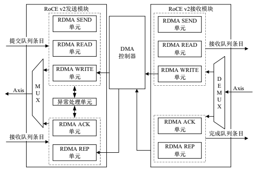 SEND 单元:当接收到来自远程主机的 SEND 包后,SEND 单元将解析 SEND 数据包中的远程主机信息,并存储到队列管理模块的寄存器中,而后生成接收队列条目并写入接收队列。