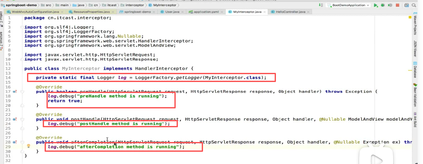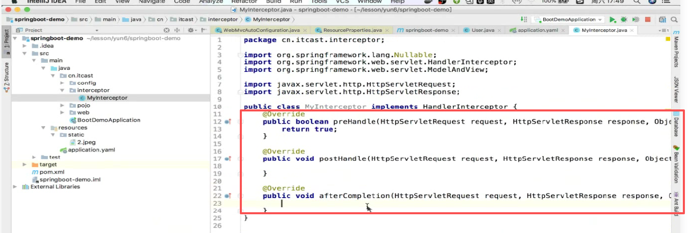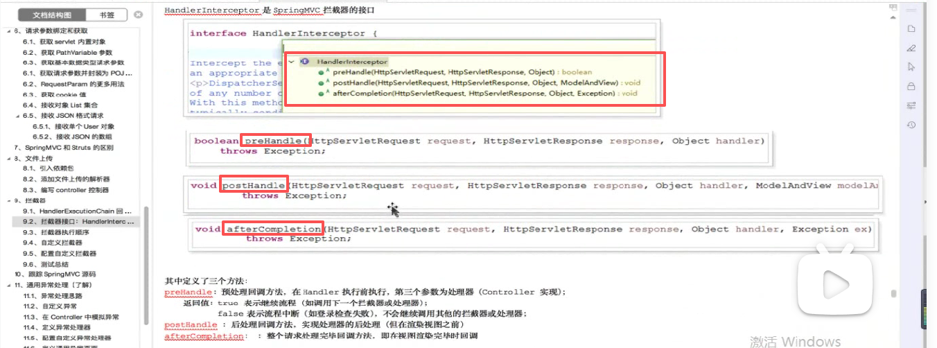 要实现一个接口HandlerInterceptor,然后实现三个方法: