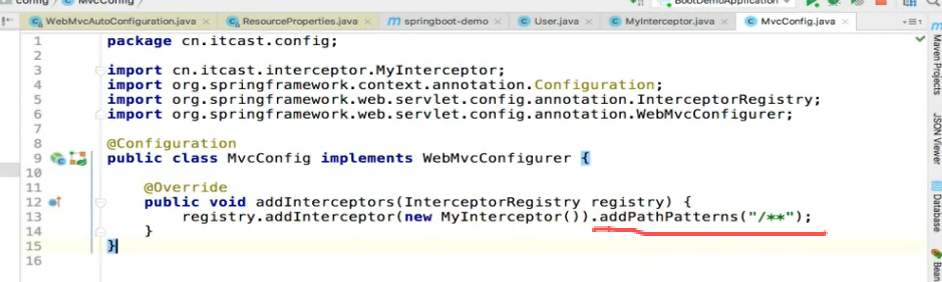 实现addInterceptors ()方法: