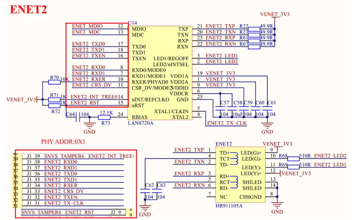 ENET1 的复位引脚连接到 SNVS_TAMPER7 上,对应 GPIO5_IO07,ENET2 的复位引脚连
