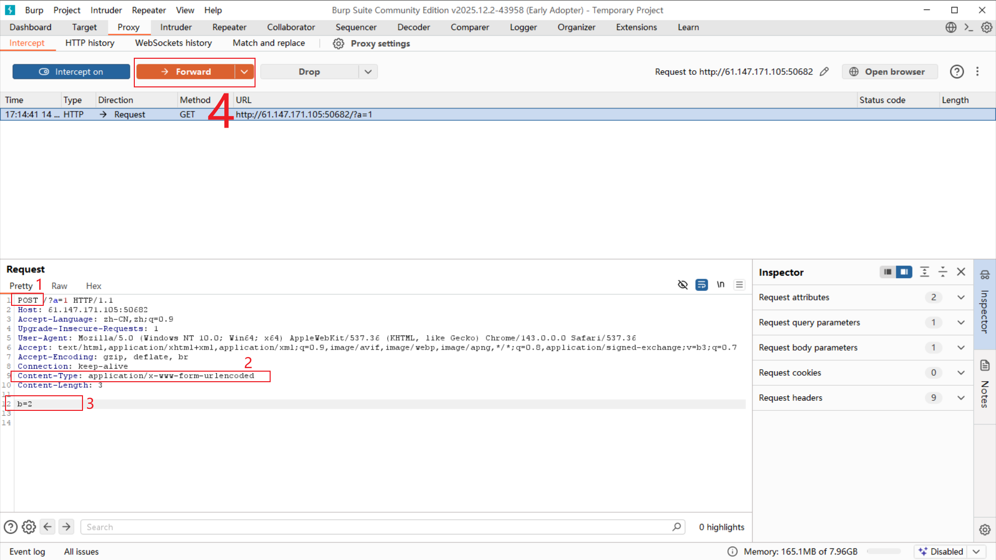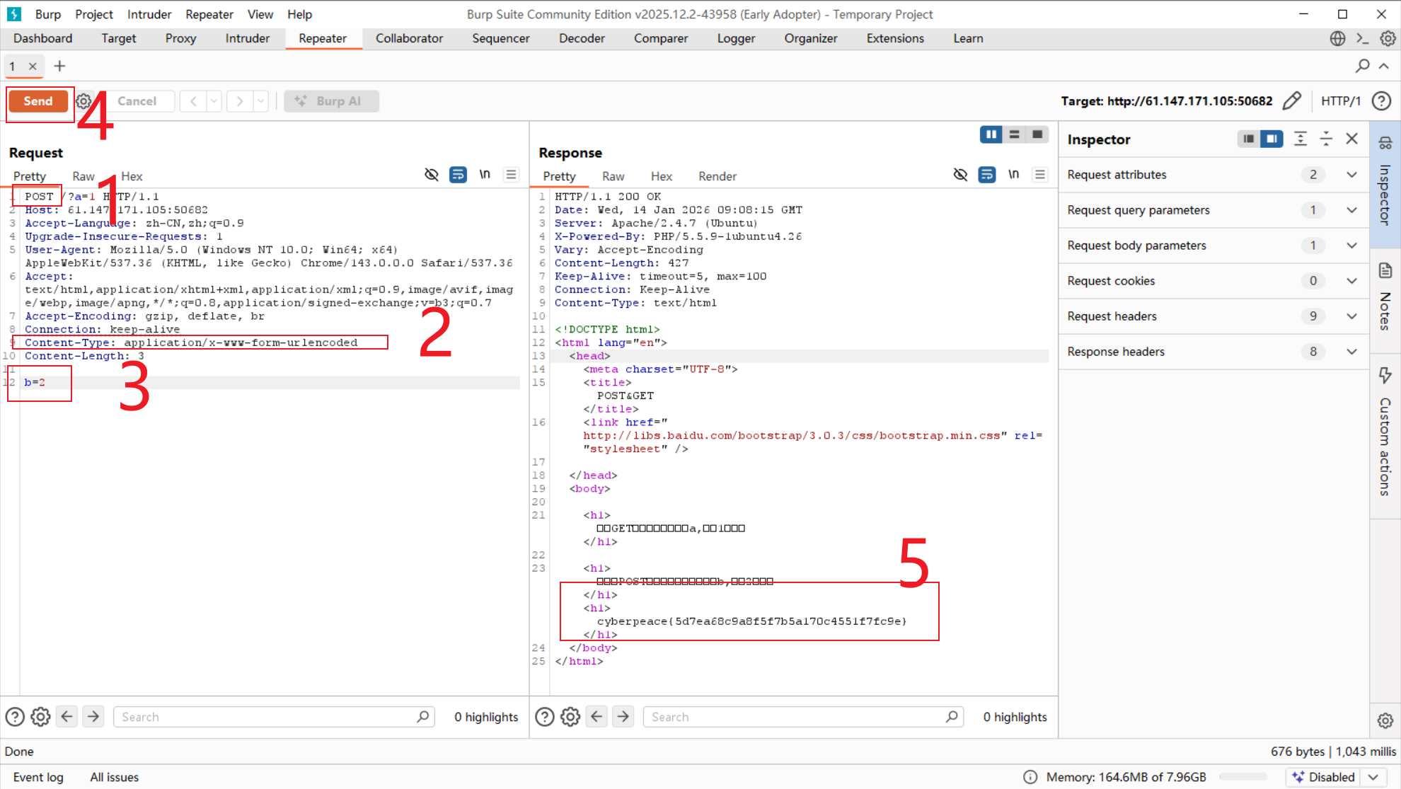 - 切换到Repeater菜单,按照下面的操作也可得到数据