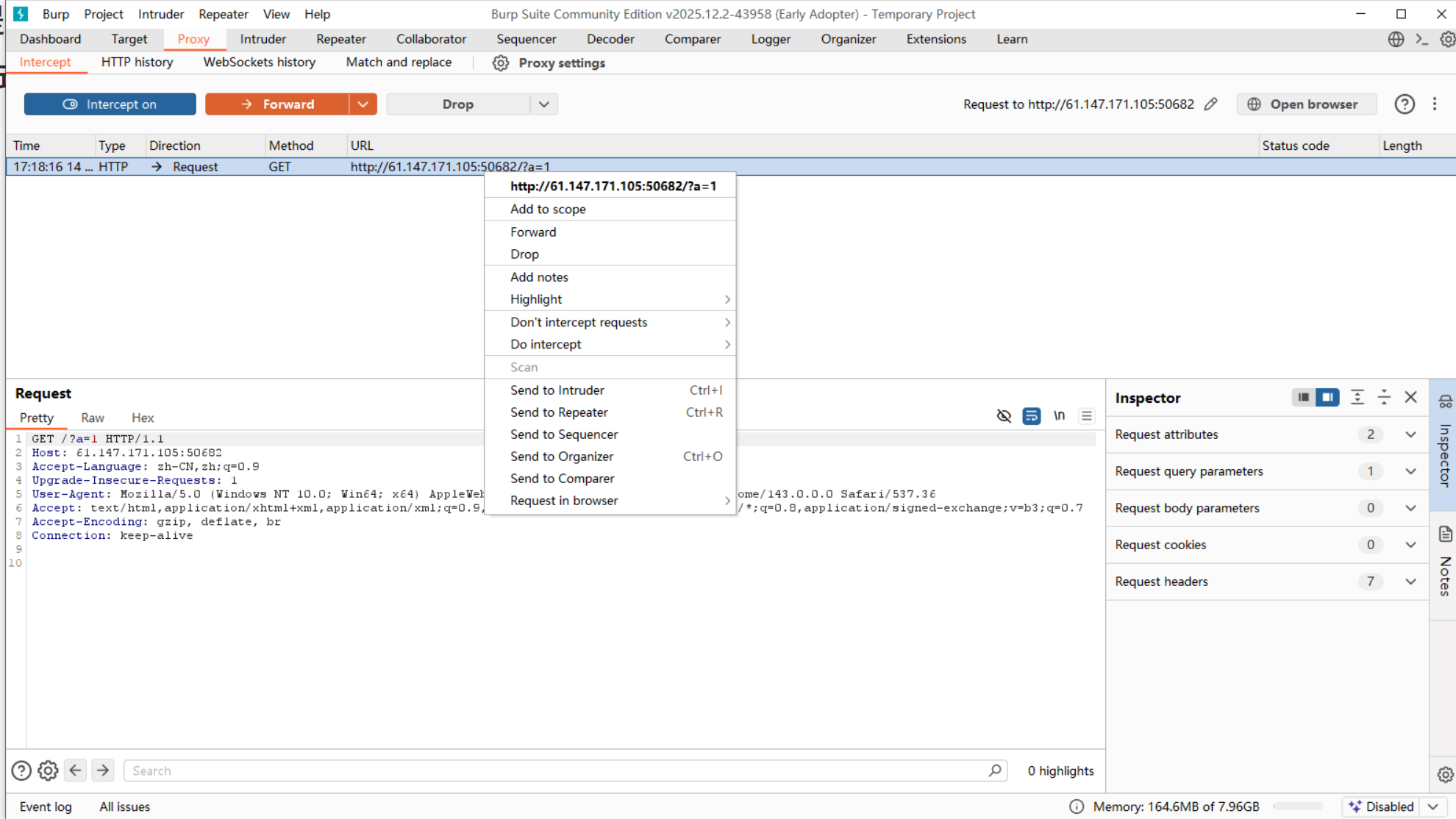 - 在拦截到的请求处,右键 --> Send to Repeater