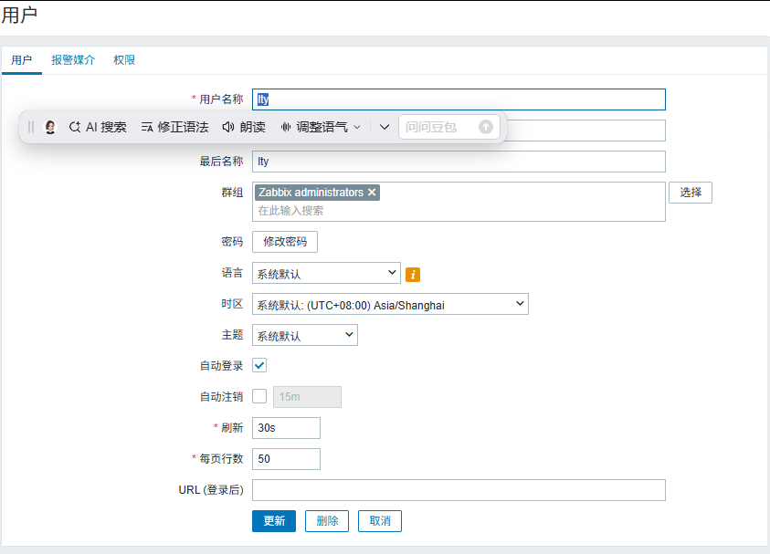 mysql> GRANT SUPER ON *.* TO zabbix@'10.0.0.%'; #授予 SUPER 超级权限