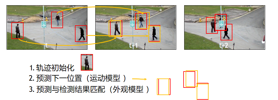 对于MOT,最常应用的框架就是"Tracking-by-Detection"。现在主流的MOT都基于这个框架。这个框架的主要思想是先检测前后两帧的目标,然后通过算法将目标相互关联起来。