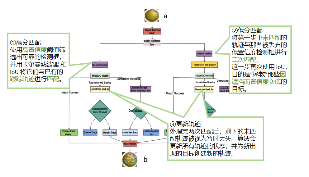 - 两阶段匹配:阶段一:高分检测框 → 更新轨迹。 阶段二:低分检测框 → 补充更新轨迹