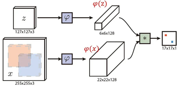 - 用 Siamese 网络(共享权重双分支),提取模板与搜索区特征