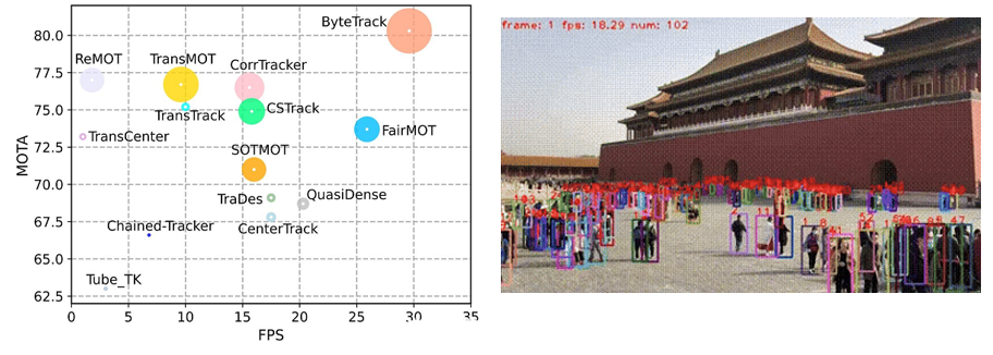 左图是论文中对于ByteTrack效果的评估展示。横轴(FPS)是帧数 ,反映运行速度。纵轴(MOTA)身份保持精度指标 ,半径是IDF,身份识别精度,半径越大精度越高 可以看出,ByteTrack:MOTA、FPS 均处于较高水平,且圆半径大,说明在跟踪精度、速度、身份识别上综合表现优异,是性能均衡的强算法。 右边的动图是一个实际的视频测试。可以看见,该方法的检测目标非常非常多,连远处墙角下的游客都能检测到。说明其身份识别的精度之高。