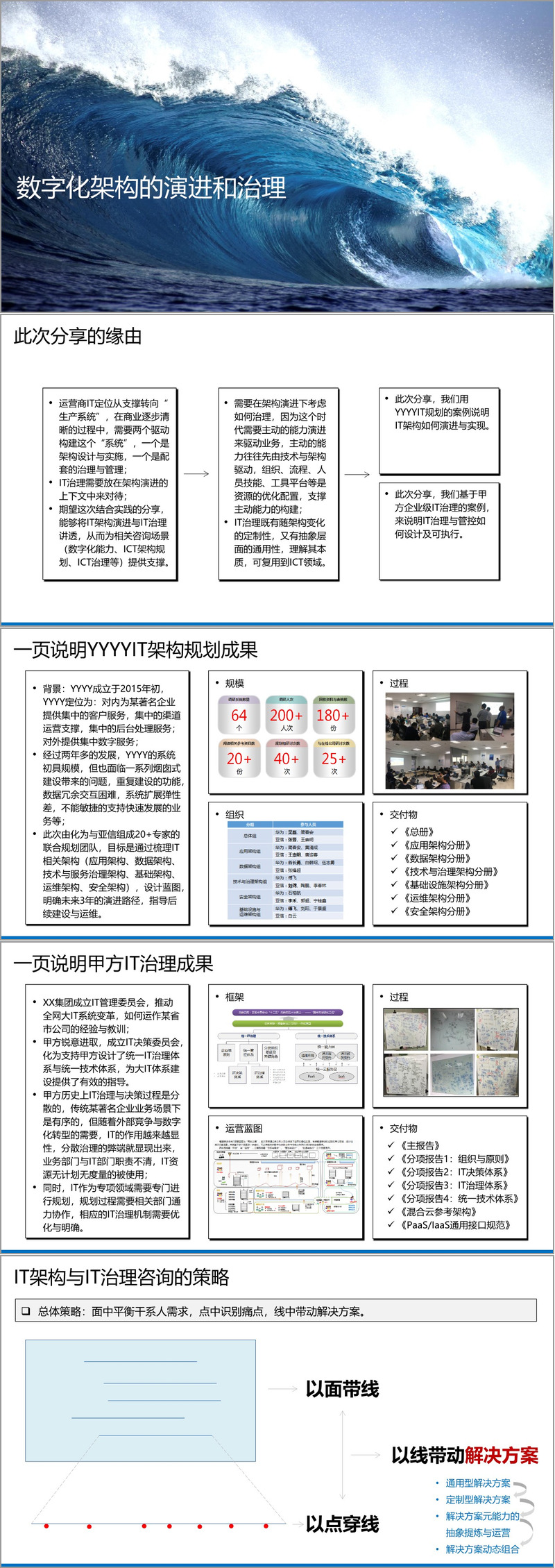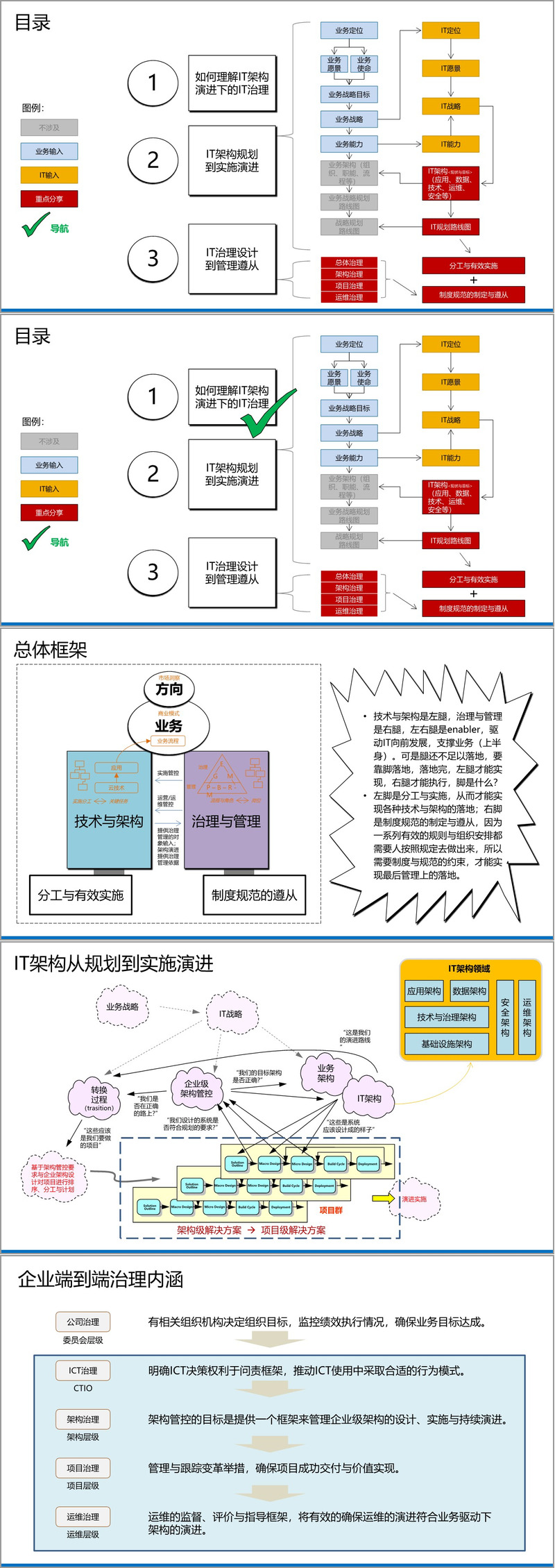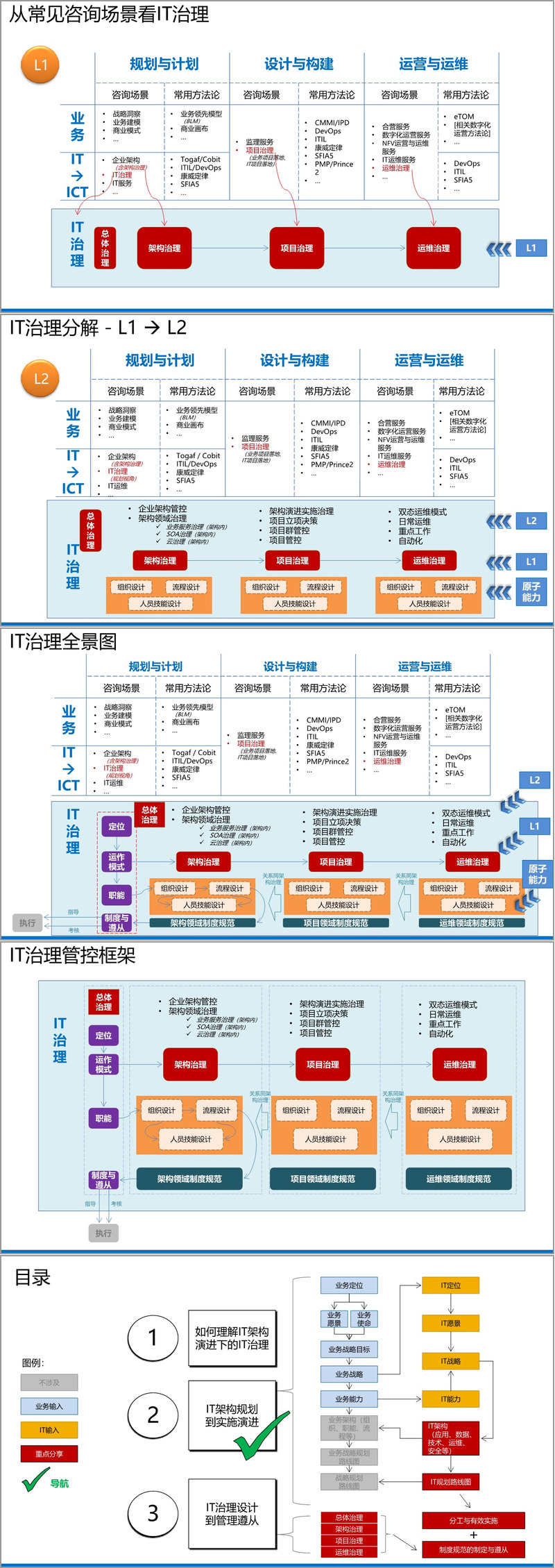 IT治理不仅是技术问题,更是组织与制度问题。文件从"乙方咨询视角"与"甲方运作视角"双重视角出发,构建了涵盖架构治理、项目治理、运维治理的三层治理框架: