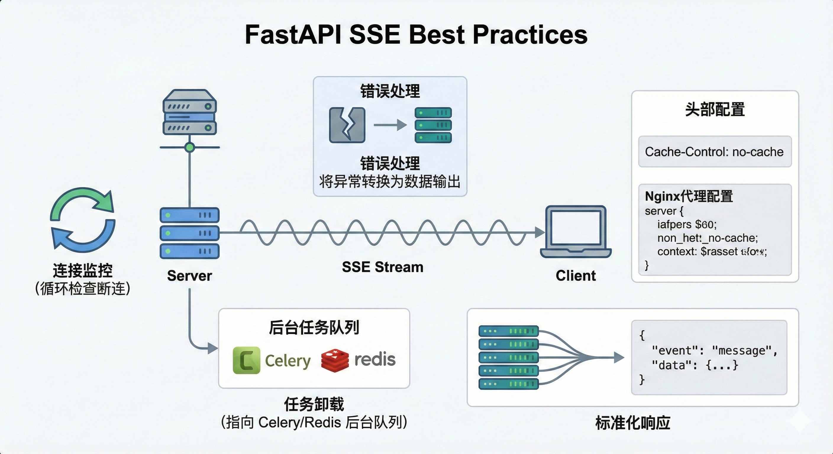 不要将耗时的后台任务放在流式响应中进行执行,流式响应只适合做实时响应,这样会导致任务执行一直卡死在SSE并且无返回,并且在执行流式响应时需要设置抖动(尤其针对于轮询/进度条的流式响应),防止一直在执行流式响应导致系统卡死