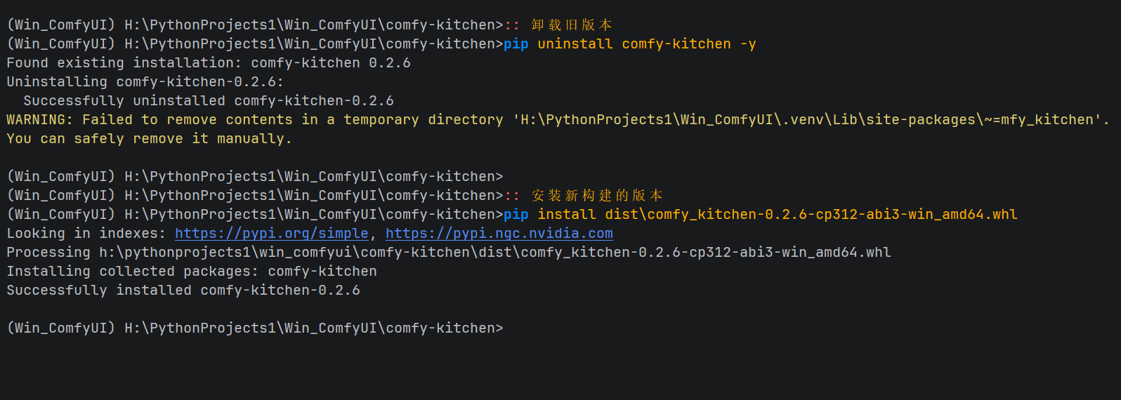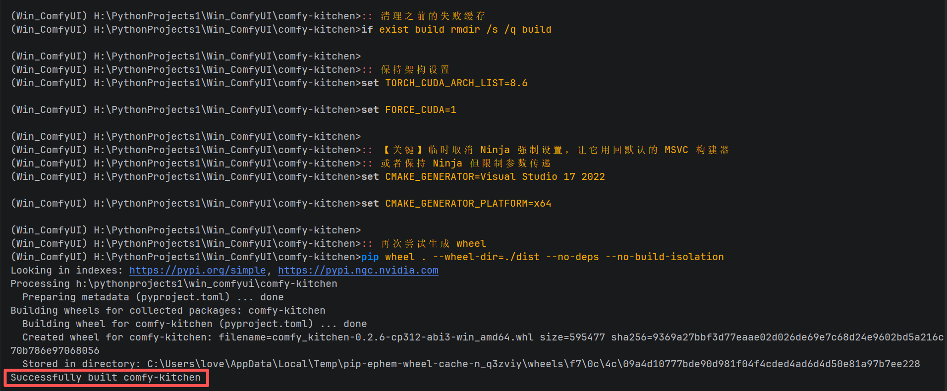 :: 在激活的虚拟环境中 cd H:\PythonProjects1\Win_ComfyUI\ git clone https://github.com/Comfy-Org/comfy-kitchen.git cd comfy-kitchen set TORCH_CUDA_ARCH_LIST=8.6 set FORCE_CUDA=1 set CMAKE_GENERATOR=Visual Studio 17 2022 pip wheel . --wheel-dir=./dist --no-deps --no-build-isolation这一步生成了与我们环境完美契合的二进制安装包。