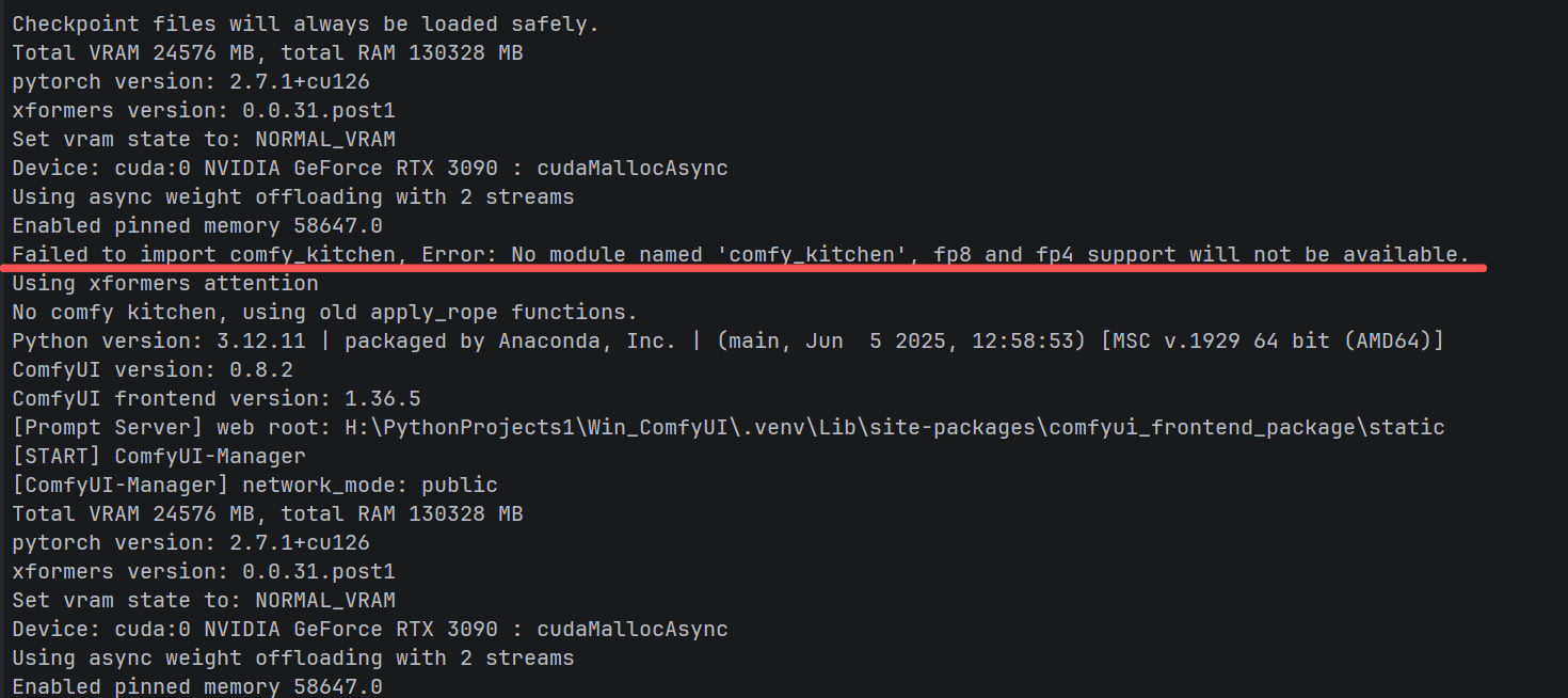 警告:Failed to import comfy_kitchen, Error: No module named 'comfy_kitchen', fp8 and fp4 support will not be available.