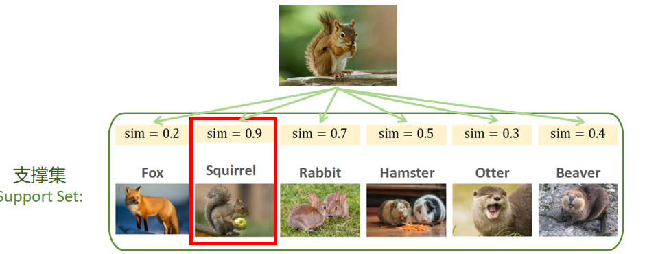 - 用预定义的 "度量方式"(比如欧氏距离、余弦相似度),计算查询样本与支撑集样本的特征相似度,相似度最高的类别就是预测结果。
