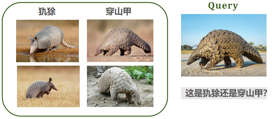 假设你没有见过犰狳和穿山甲。现在左边给了你四张图,并告诉你了左边两张是犰狳,右边两张是穿山甲。现在给你一张新的图,你可以仅通过已知的四张图判断,新的图是犰狳还是穿山甲吗? 大多数人可能分不清犰狳和穿山甲,但是只要给出四张图片,都能进行正确的分类。既然人只要四张图片就能做出分类,那计算机是否可以呢?这里的。数据集只有四张图片,每个类只有两张图片。这么小的数据集,不足以拿去训练一个完整的神经网络。而少样本学习,就是为了解决这样一个问题。