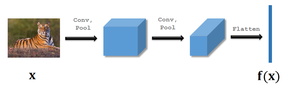 打一个卷积神经网络用来提取特征。这个网络有很多层,输入为图片,输出特征向量,记为fx