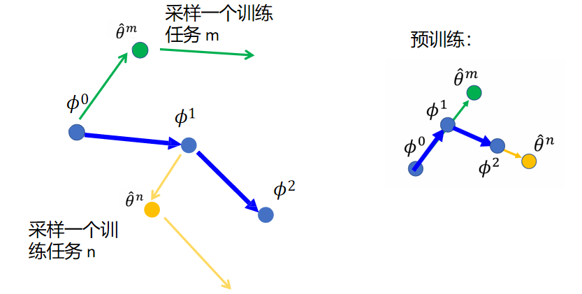 对比一下预训练:相比maml,少一次对于损失函数的偏微分。也就是说,每次只计算一步就得出新的参数φ