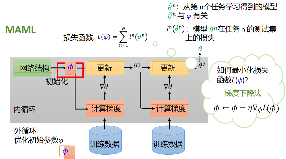 (左上角)首先定义一个损失函数,输入是初始化的参数。将初始化的参数在不同的任务重进行训练