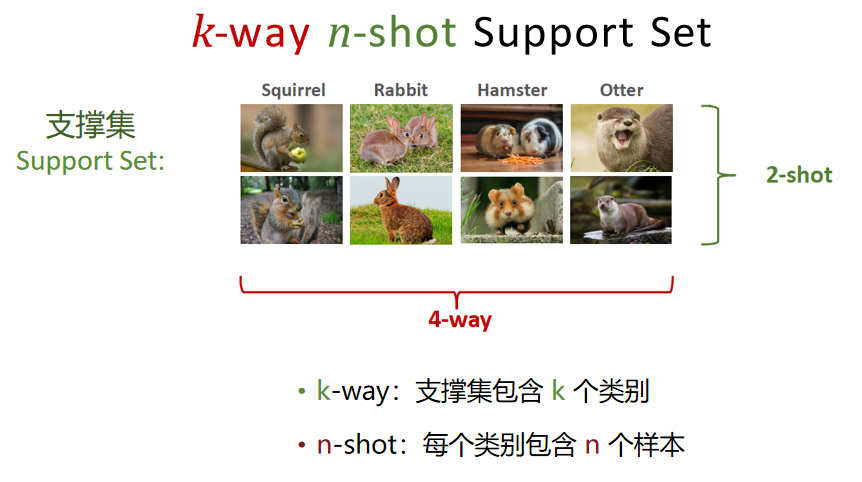 - 对应图:支撑集里有 Squirrel(松鼠)、Rabbit(兔子)、Hamster(仓鼠)、Otter(水獭),共 4 个类别 → 这是4-way。