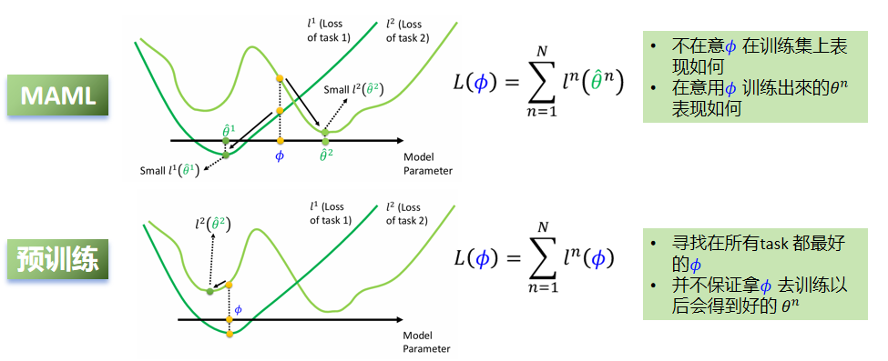 对于MAML,不在意𝜙在训练集上表现如何。在意用𝜙训练出來的θ^n表现如何。也就是像图里的φ一样,它对应的地方在两个绿色的线上面都不是最低值。但是以这个值作为初始开始训练,他们只要沿着梯度下降,很快就能达到各自task的loss最低值。因此这就是一个好的初始值