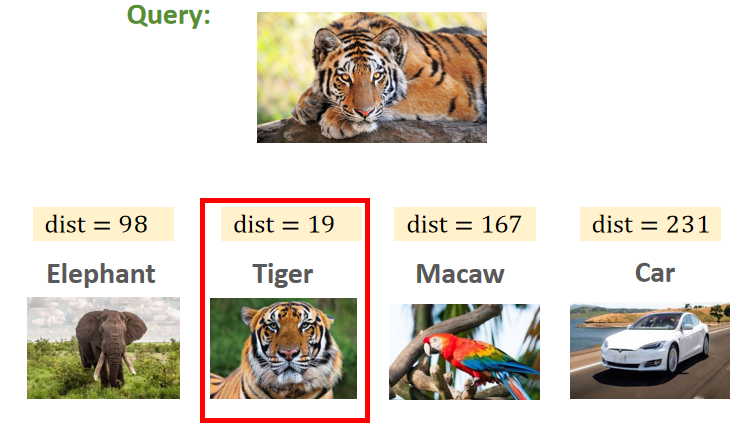 训练好之后我们来给他进行分类。给一个query,用神经网络提取特征,比较特征向量的距离。算出所有的距离然后找到距离最小的。