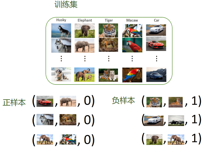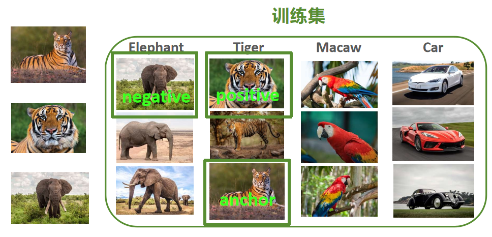 这样准备训练集:首先训练集里面随机选一个图片,记录下这个图片,设这个图片为锚点。 从同类别里面随机抽一个图片,将其记录为正样本。 再抽一个别的类别的图片,几率为负样本。