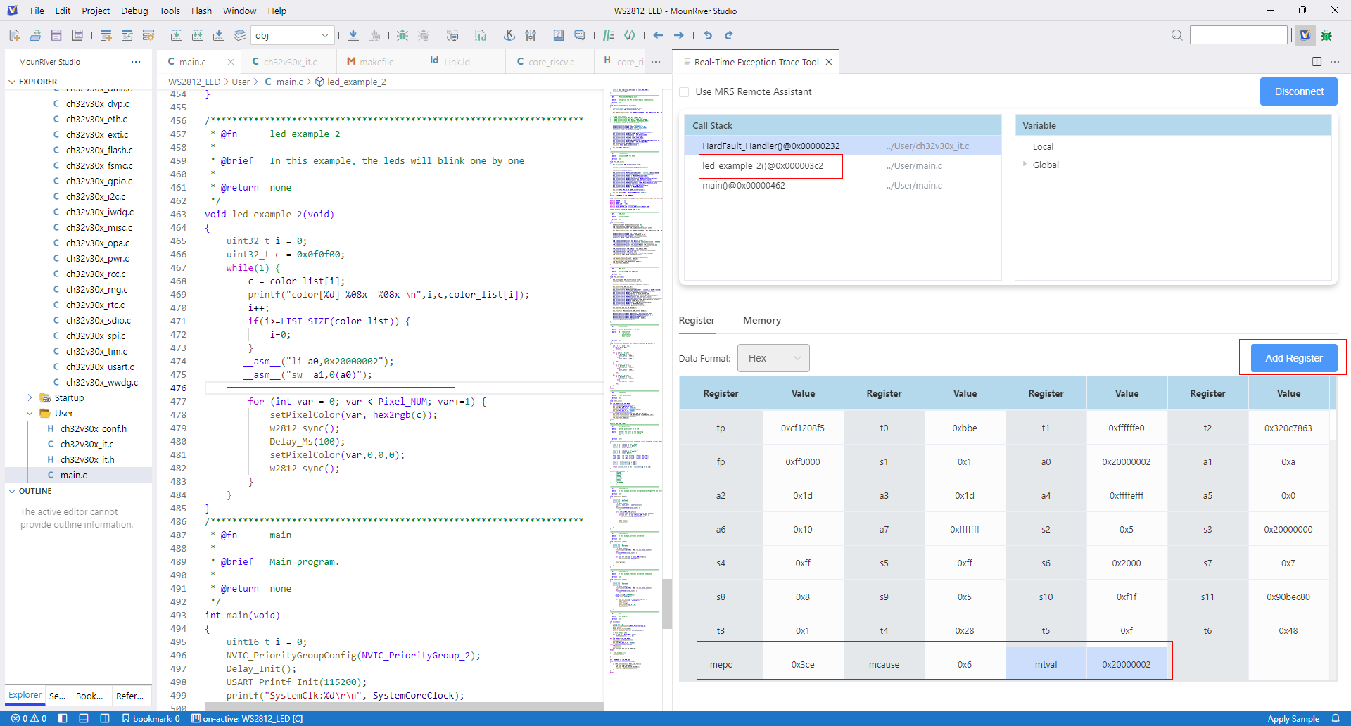 在线异常追踪的使用:以 CH32V307EVT 的 WS2812_LED 工程为例,能够明确发现系统是在执行 led_example_2 函数时触发 Hard Fault 异常并进入异常处理流程。接下来,可以通过获取 mcause、mtval、mepc 等寄存器的值,进一步定位出错的位置以及故障原因。