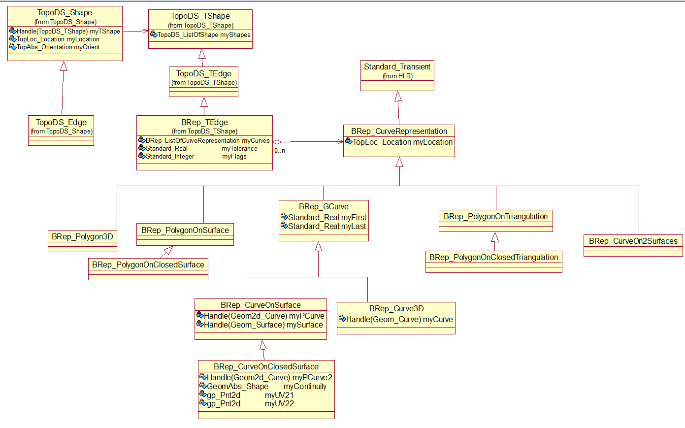 TopoDS_Edge从TopoDS_Shape派生,myTShape指向的是BRep_TEdge,而BRep_TEdge中有一个BRep_CurveRepresentation对象句柄的数组成员。