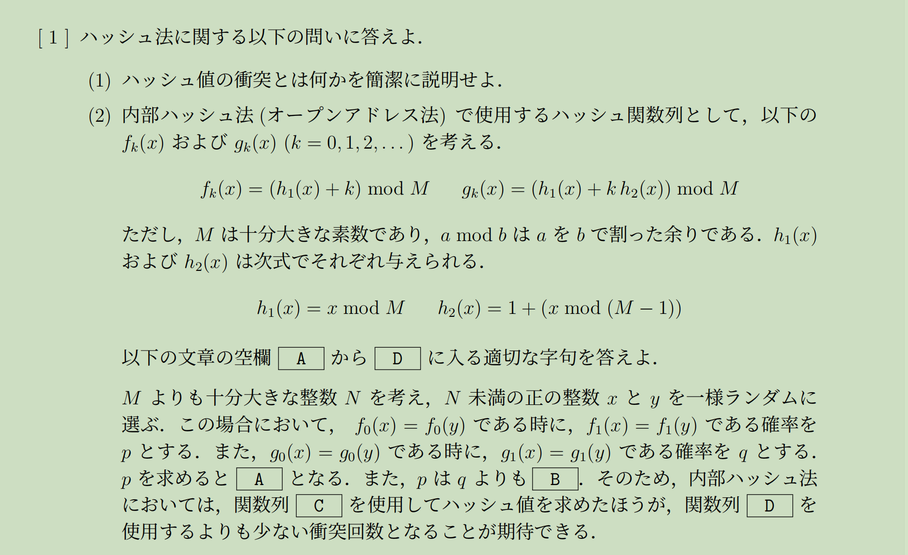 在内部哈希法(开放地址法)中,考虑以下两种哈希函数序列((k=0,1,2,\dots)):