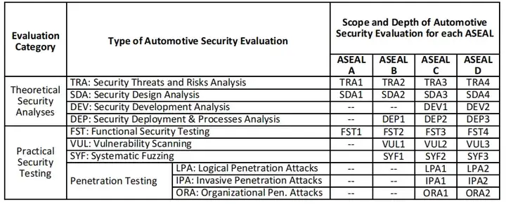 其次,本文的另一项贡献是首次提出建立所谓的 "汽车安全评估防护等级"(ASEAL),该等级定义了多达四个离散的安全测试级别,明确了某一 ASEAL 应包含哪些安全分析和测试,以及这些安全分析和测试应执行的 "深度"(参见第 6 节表 1)。